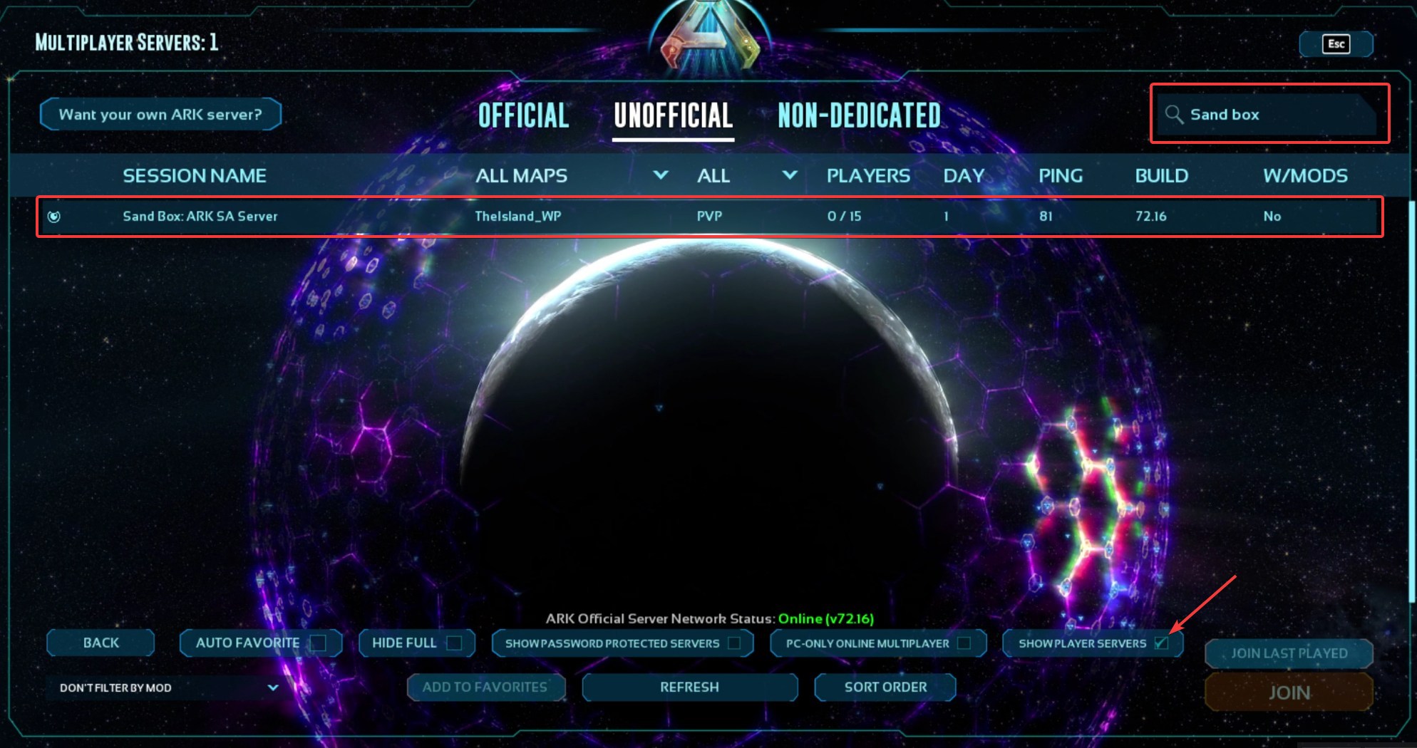 Search the Name Server on the in-game server list. Make Sure that 'Show Player Server'