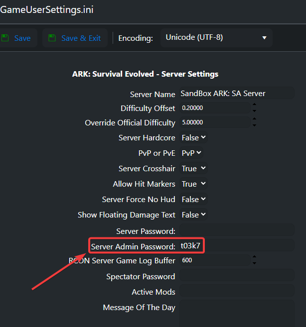 Open GameUserSettings.ini using either the Config Editor or the Text Editor..